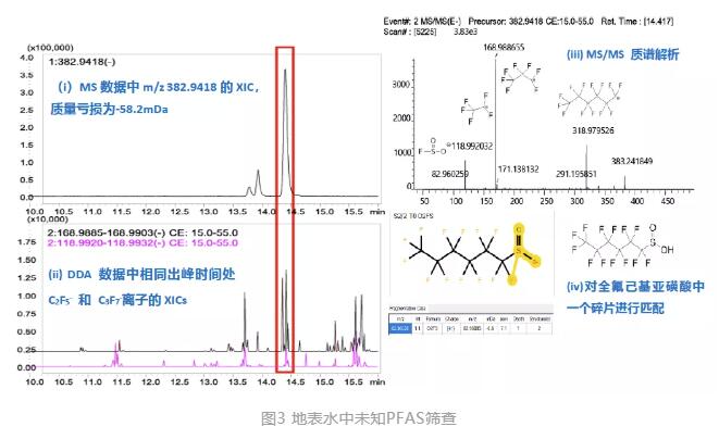 利用質量虧損過濾和特征碎片離子進一步篩查,發現(-)m/z 382.94179可能是一個未知PFAS:(i)匹配的質量虧損(-58.2 mDa),(ii)發現了C2F5-和C3F7-。采用分子式預測軟件,得到了高度匹配的分子式C6F13SO2H,質量誤差為+0.26 ppm,與MS/MS質譜中的碎片與C6F13-和FSO2-相匹配,推測該PFAS可能是全氟己基亞磺酸或其類似物(圖3)。