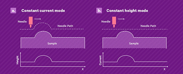 b恒定高度模式:尖端在樣品上掃描并記錄隧道電流時保持恒定高度,這與表面形貌和電子電荷密度有關(guān)。