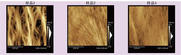 三種市售鋰離子電池檢測:將其隔膜取出,采用島津SPM-9700HT的動態(tài)模式進(jìn)行表面形貌觀察,如下圖所示,圖中黑色部分表示隔膜中的孔隙,其確保鋰離子的自由進(jìn)出,確保充放電過程的進(jìn)行。孔隙的大小及密度直接關(guān)系到隔膜的性能及應(yīng)用范圍。
