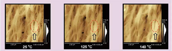 電子產(chǎn)品在使用過程中會不斷產(chǎn)生熱量,導(dǎo)致隔膜的使用溫度不斷上升,我們又該如何模擬不同溫度下隔膜的使用情況呢?為解決上述問題,島津SPM還貼心配備了環(huán)境控制艙,可實(shí)現(xiàn)對樣品的原位加熱。以樣品1為例,如下圖所示: