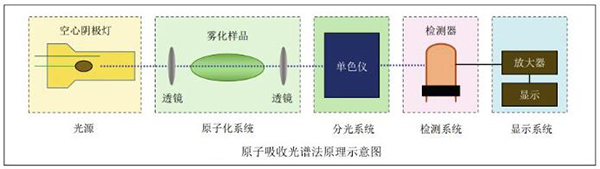 一般相關(guān)儀器由光源、原子化系統(tǒng)、分光系統(tǒng)、檢測系統(tǒng)和顯示系統(tǒng)五個部分組成。光源一般采用銳線光源,以空心陰極燈常見;原子化系統(tǒng)是將待測樣品中的待測元素轉(zhuǎn)化為氣態(tài)基態(tài)原子狀態(tài)的裝置,對不同的待測元素和待測樣品狀態(tài),常見的原子化方式有火焰原子(Flame Atomic,FA)、石墨爐原子化(GraphiteFurnace Atomization,GFA)、冷原子化(Cold-vaporAtomization, CVA)和電熱原子化(ElectrothermalAtomization, ETA);分光系統(tǒng)主要是通過狹縫和光柵將待測元素的特征譜線和元素周圍的譜線分開,以便于檢測;檢測系統(tǒng)和顯示系統(tǒng)是將光信號進行分析處理轉(zhuǎn)化為電信號,并顯示出吸光度值。