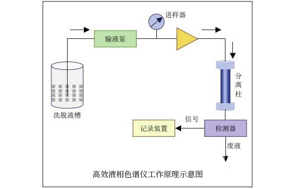 該法儀器由六大部分組成,即洗脫液槽、輸液泵、進樣器、分離柱、檢測器和信號記錄裝置。其工作原理是輸液高壓泵連續(xù)地將流動相按一定流速流過柱子,通過進樣器,注入待測樣品混合物,由于混合物中各組分不同,因而它們在柱內(nèi)移動速度不同而逐漸分離,通過檢測器檢測,得到組分的電信號并進行放大,記錄儀將放大的電信號以圖形形式記錄下來。