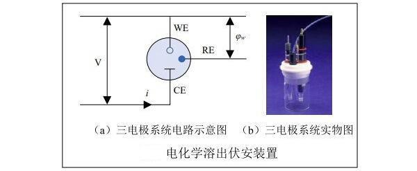 電化學溶出伏安裝置核心部分為三電極系統(tǒng),包括工作電極(固體電極),對電極(鉑電極)和參比電極(飽和甘汞電極),極化電壓施加在工作電極和對電極之間,相應回路中有電流通過,用于電流測量,由于工作電極和參比電極組成原電池測量裝置,其回路中電流趨于零。