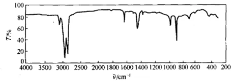 ④在3000~2800cm-1的吸收峰表明有-CH3、-CH2-存在,在2960cm-1、2920cm-1、2870cm-1、2850cm-1的強吸收峰表明存在-CH3和-CH2-的vC-H(as)、vC-H(s),且-CH2-的數目大于-CH3的數目,從而推斷此化合物為一直鏈烯烴。在715cm-1出現的小峰,顯示-CH2-的面內搖擺振動δ-CH2-,也表明長碳鏈的存在。