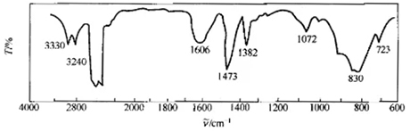②由3330cm-1和3240cm-1出現vN-H的2個中等強度吸收峰,可初步判斷它可能為胺類。在1606cm-1呈現δN-H的特征中等強度寬峰,在1072cm-1呈現vC-N弱吸收峰和在830cm-1呈現的γN-H寬吸收峰,都進一步確證此化合物為胺類。