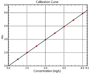 UV-2700i實現了低雜散光,擴展測定范圍至8Abs,透過率0.000001%。除了測定高濃度樣品不需要稀釋外,此系統還能用于評價偏振膜的透過率性能。高錳酸鉀溶液濃度和吸光度的線性曲線。直到8Abs都有好的線性。