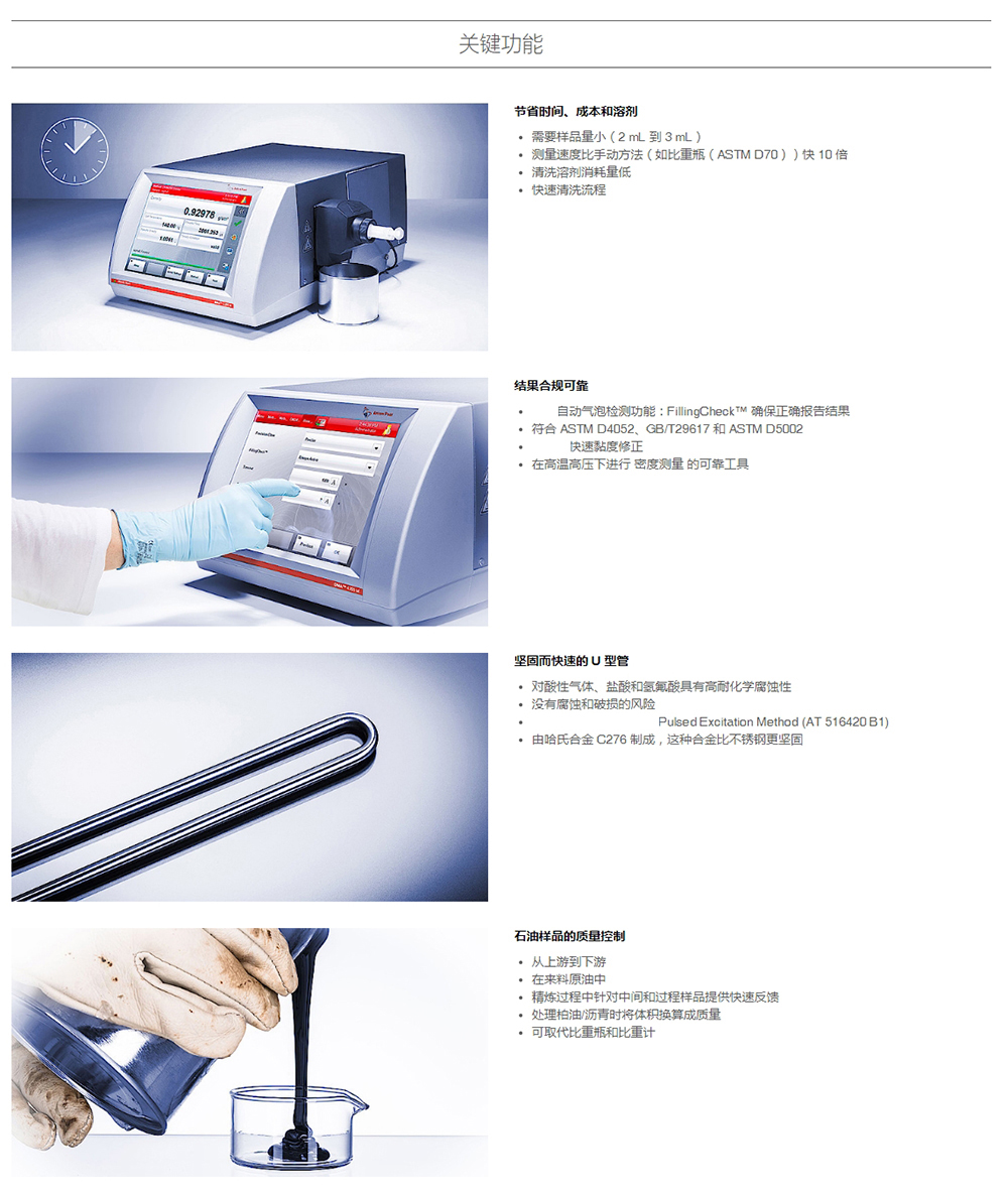 DMA 4200 M 是一款適用于特殊條件的密度計。它可在 -10°C 到 200°C 的溫度范圍內(nèi)和 500bar的高壓下測量密度。DMA 4200 M 使用的 Pulsed Excitation Method 基于對振蕩特性的全面了解,可提供穩(wěn)定的密度結(jié)果。自動氣泡檢測 FillingCheck功能使 DMA 4200 M 符合 ASTM D4052、GB/T29617 和 ASTM D5002 標準。通過快速全新黏度修正來消除黏度影響,從而確保密度結(jié)果準確度高達 0.0002 g/cm3。利用 DMA 4200 M的 Temperfect功能,可以在大氣壓力下在 0°C 到 150°C 之間的任何溫度下即刻測量密度。 DMA 4200 M 可改善、加速并簡化重質(zhì)石油樣品的密度測量。